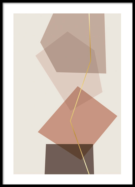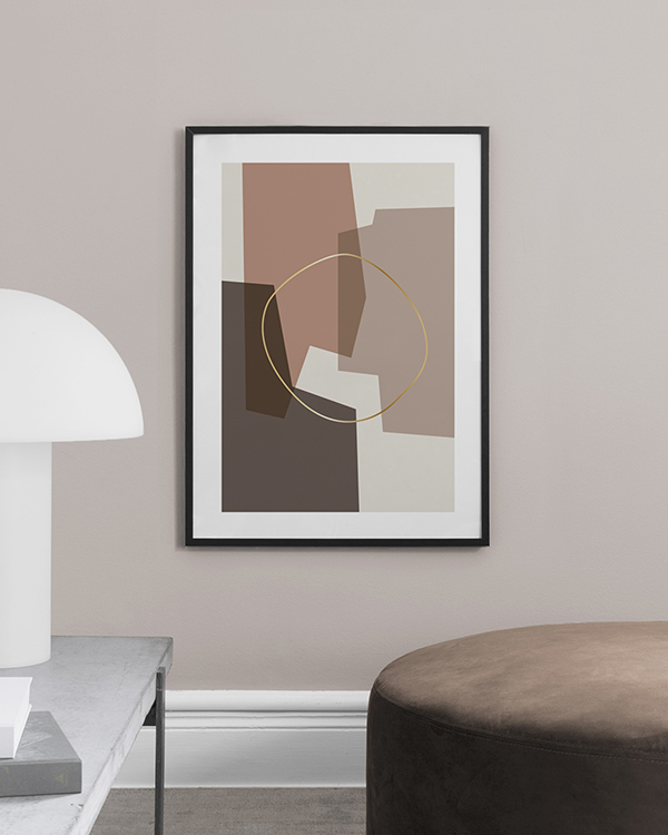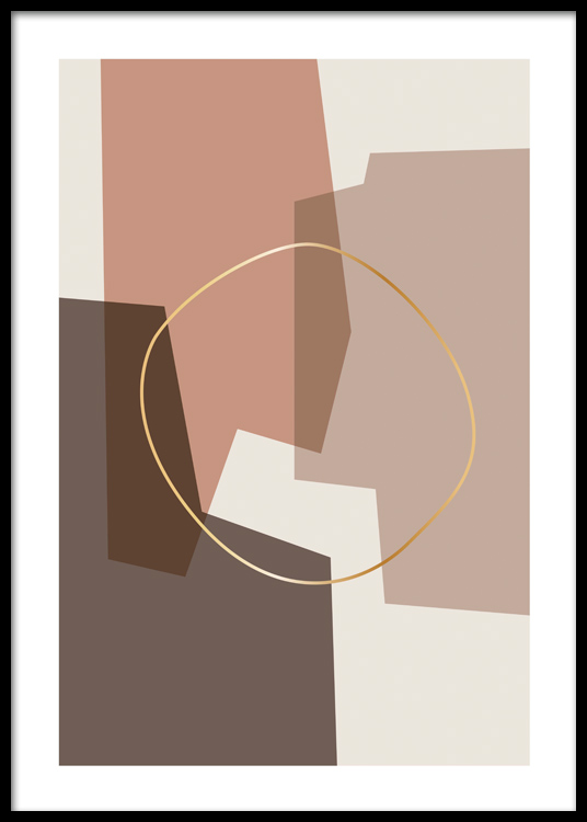 Handpicked design Graphic illustration with abstract shapes in beige and light red with a golden circle in the middle (not gold foil). The soft and neutral colours combined with a golden touch makes this print perfect for a home that's down to earth.