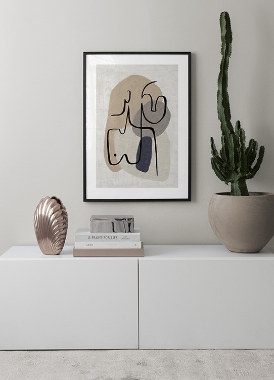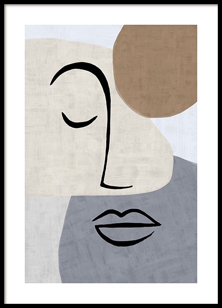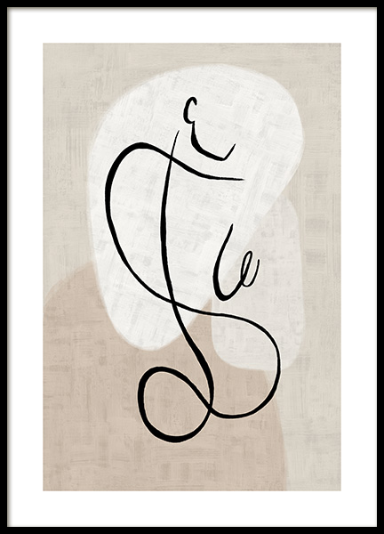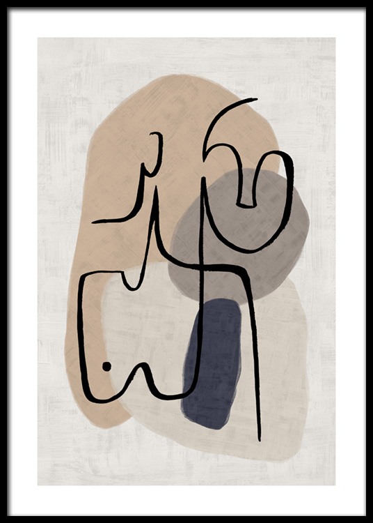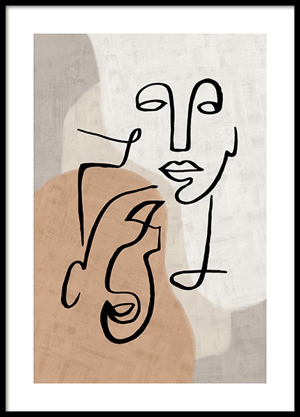 Handpicked design Abstract illustration with black painted lines forming faces and a body, with beige shapes and a structured background. Find peace and joy in your art at home, and let some abstract art take place on your walls.