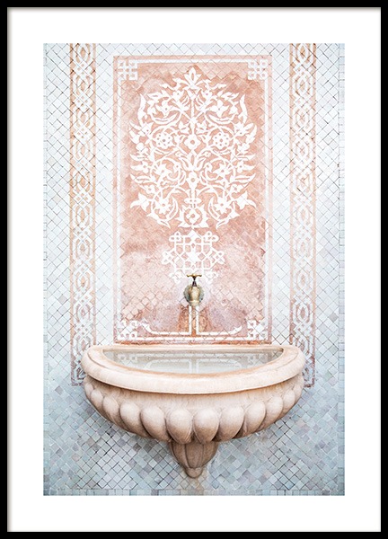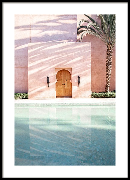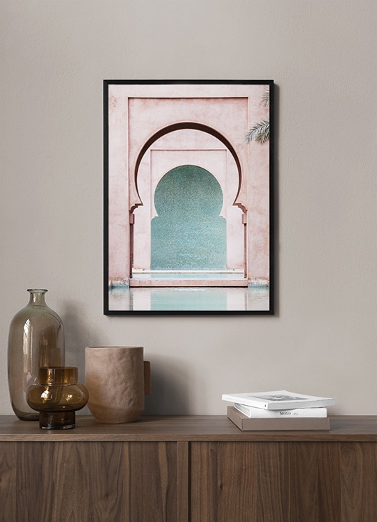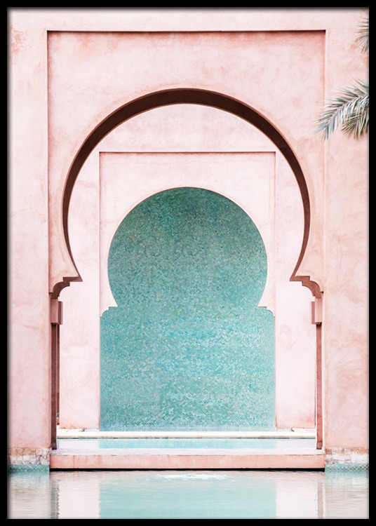 Handpicked design Photograph of a pink wall with curved arches and a blue wall in the background. Our love for pastel architecture will never fade! This truly highlights the beauty and mystery of Marrakech, showcasing ancient architecture made with the uttermost detail. This print is part of Studio Amara, a photo collection shot by Desenio Design Studio in Marrakech.