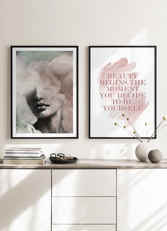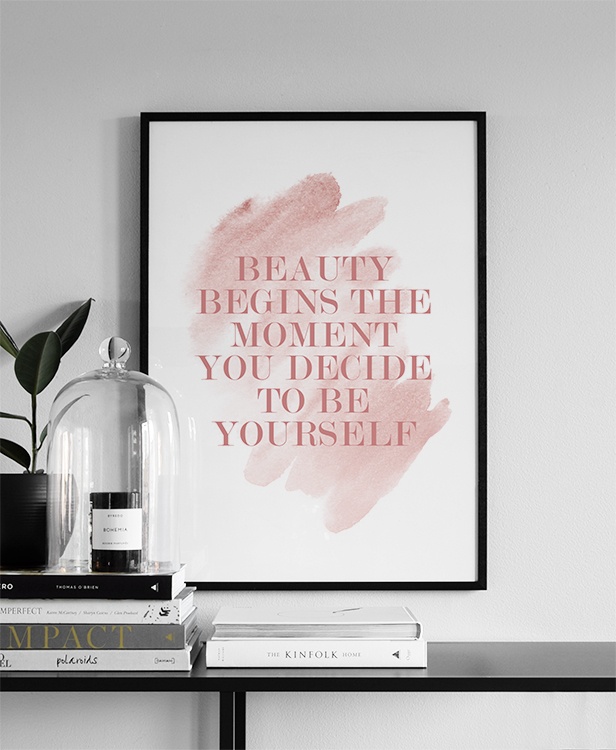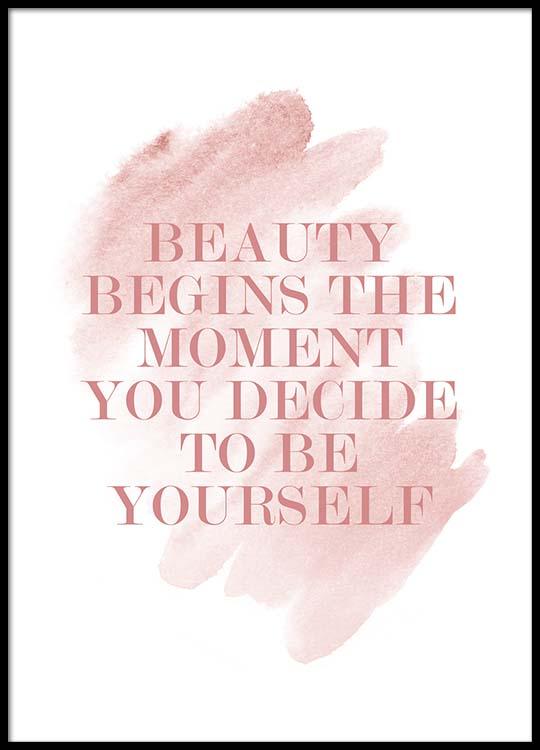 Handpicked design Text poster with the phrase "Beauty begins the moment you decide to be yourself" in with pink watercolour behind it. Match this poster with other fashion posters for a complete gallery wall, and let your home be filled with inspiring art that makes you keep your head up!