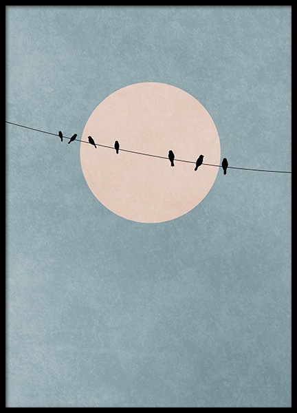 Handpicked design Graphical illustration of a flock of birds in front of a pink moon and a blue sky. Add some graphical art to your home for a modern and fresh feel! The beautiful colours will make a soft impression and create a mindful feeling in your home. All that is needed in order to make your living space your favourite place.