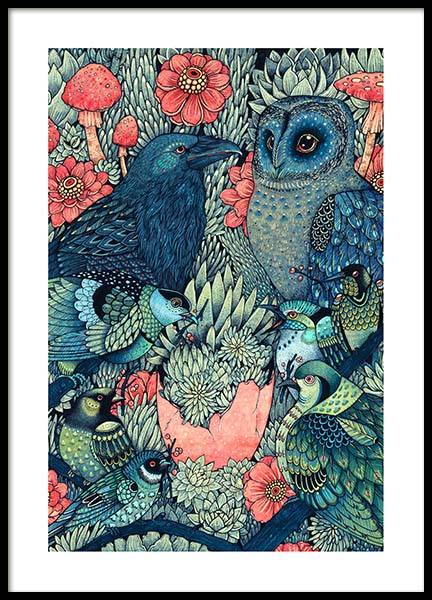 - Poster with a hand-painted motif of two colourful birds in the paradisiacal jungle.
