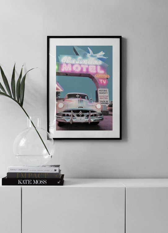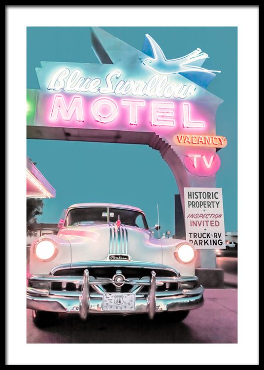 From €5.98Photograph of a vintage car in front of a blue and pink neon sign with the text Blue Swallow Motel. This colourful poster is ideal both for people who love colour and as a splash of colour for minimalists.