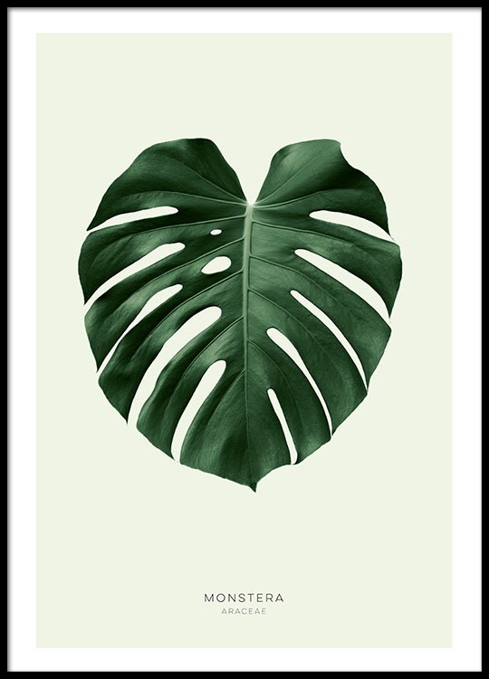 Handpicked design A stylish poster of a beautiful green monstera leaf. The discreet colours make it easy to match with many types of decor, and it looks nice with both a classic or a modern style. In the Botanical category you can find more motifs with photos and illustrations of plants, flowers and herbs. This poster is nice on its own or as part of a collage! The poster has a 'built-in' mount which elegantly frames the image.