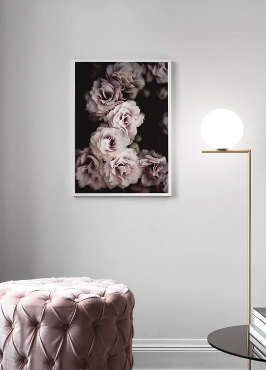 From €13.97Dark botanical poster that fits perfectly in a romantic bedroom. The light purple flowers against the dark background create a luxurious feel and the poster goes perfectly with velvet furniture. Combine with a stylish typographic print to create an interesting contrast, or pair it with one of our other floral designs.