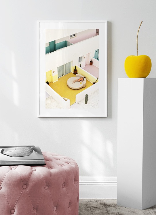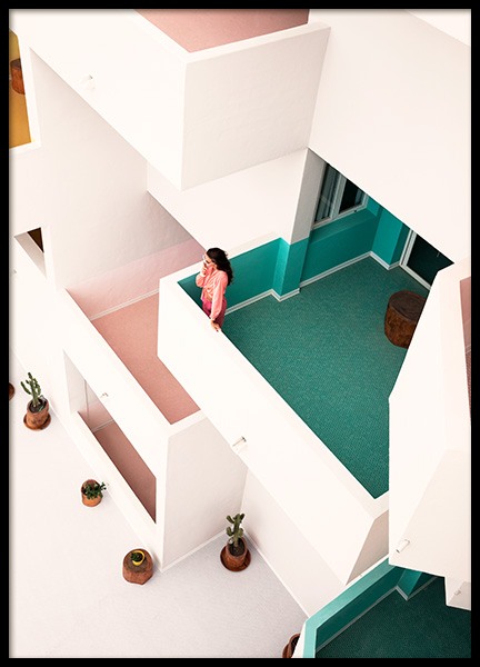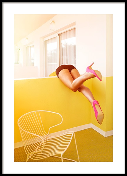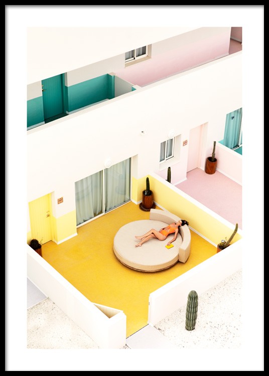 Handpicked design Photograph of a woman lounging on a balcony at hotel Paradiso in Ibiza. The poster has a white border which elegantly frames the design. This print is a part of the collection Wonderland, a Studio Collection produced by Desenio's creative team.
