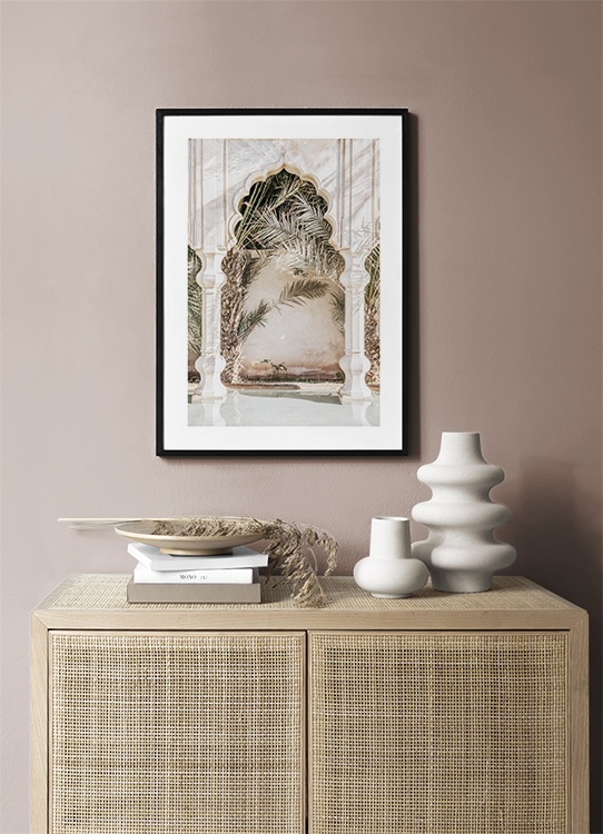 From €10.50 Photograph of shadows on a curved arch and pillars besides a pool, with palm trees in the background. With mysterious corners and pretty hues, Marrakech truly is something extra! This print is part of Studio Amara, a photo collection shot by Desenio Design Studio in Marrakech.