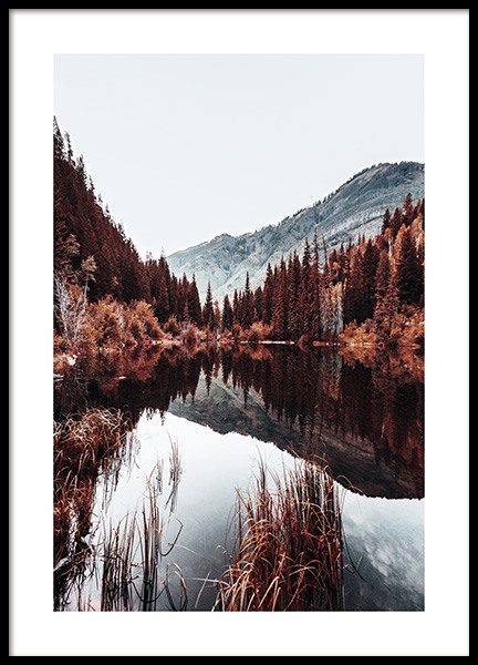 Handpicked design Photograph of a lake in the sunset with red trees in the front and mountains in the background. This beautiful print truly manages to capture the beauty of nature and all the wonders it has to offer. Give your home a well-deserved lift with this warm print, a perfect choice for a nature loving home.