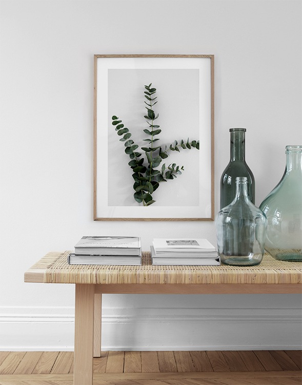 Handpicked design The poster depicts three sprigs of eucalyptus set against a light grey background. It can be paired with our Eucalyptus Branch One and Eucalyptus Branch Two posters. Poster with a white border which elegantly frames the design..