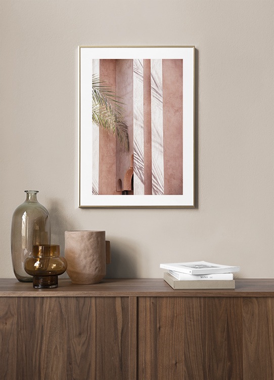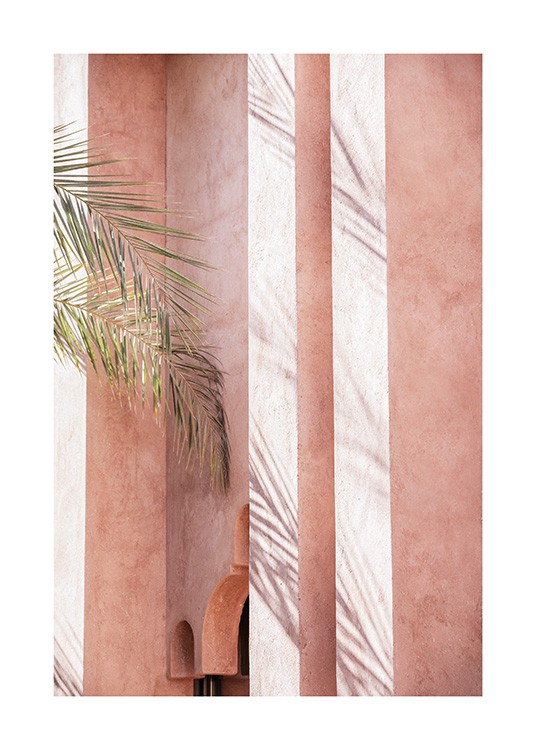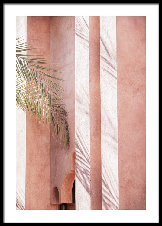 Handpicked design Photograph of shadow on a pink building with large palm leaves to the left. With bright and colourful prints your home will feel brand new in just a few seconds! This print is part of Studio Amara, a photo collection shot by Desenio Design Studio in Marrakech.