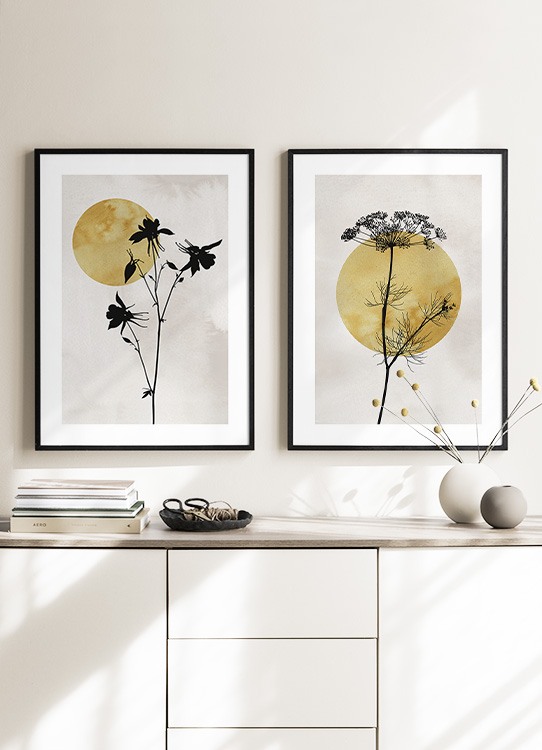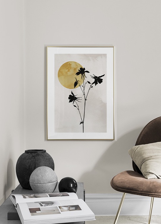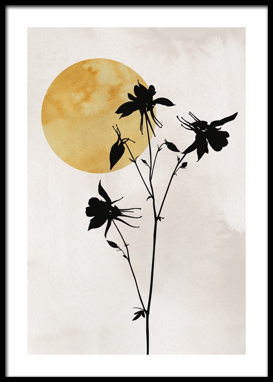 From €10.50Illustration of black flowers with a dark yellow sun in the corner, on a beige background. Draw everyone's eye to your walls with this beautiful illustration! The colour structure of the background gives a subtle depth to the print.