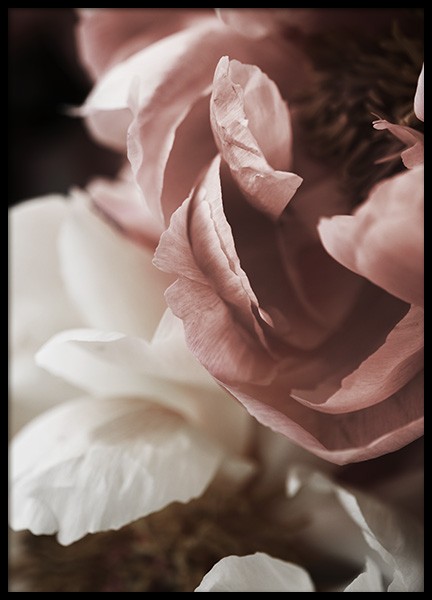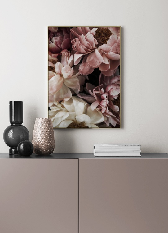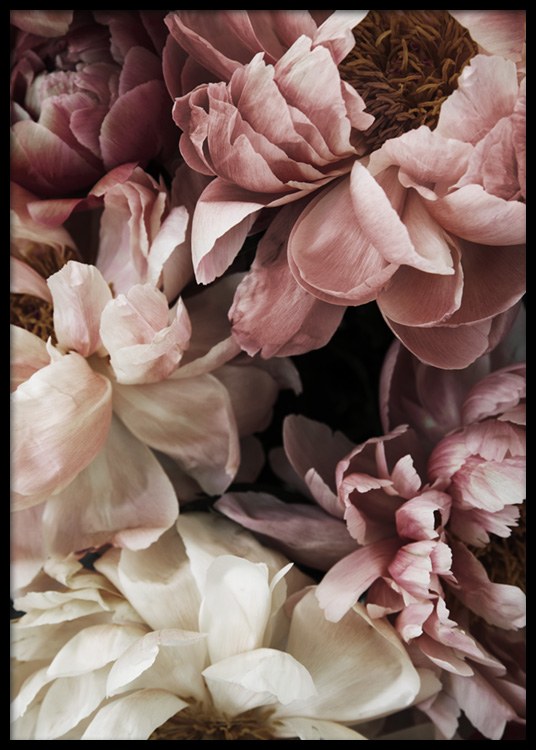 Handpicked design Photograph of big peonies in pink and white. If you want to add some romantic influences to your home, botanical prints are a perfect choice. They'll add both warmth and sensuality, making them perfect to put on your bedroom wall. Create a gallery wall filled with botanical prints!