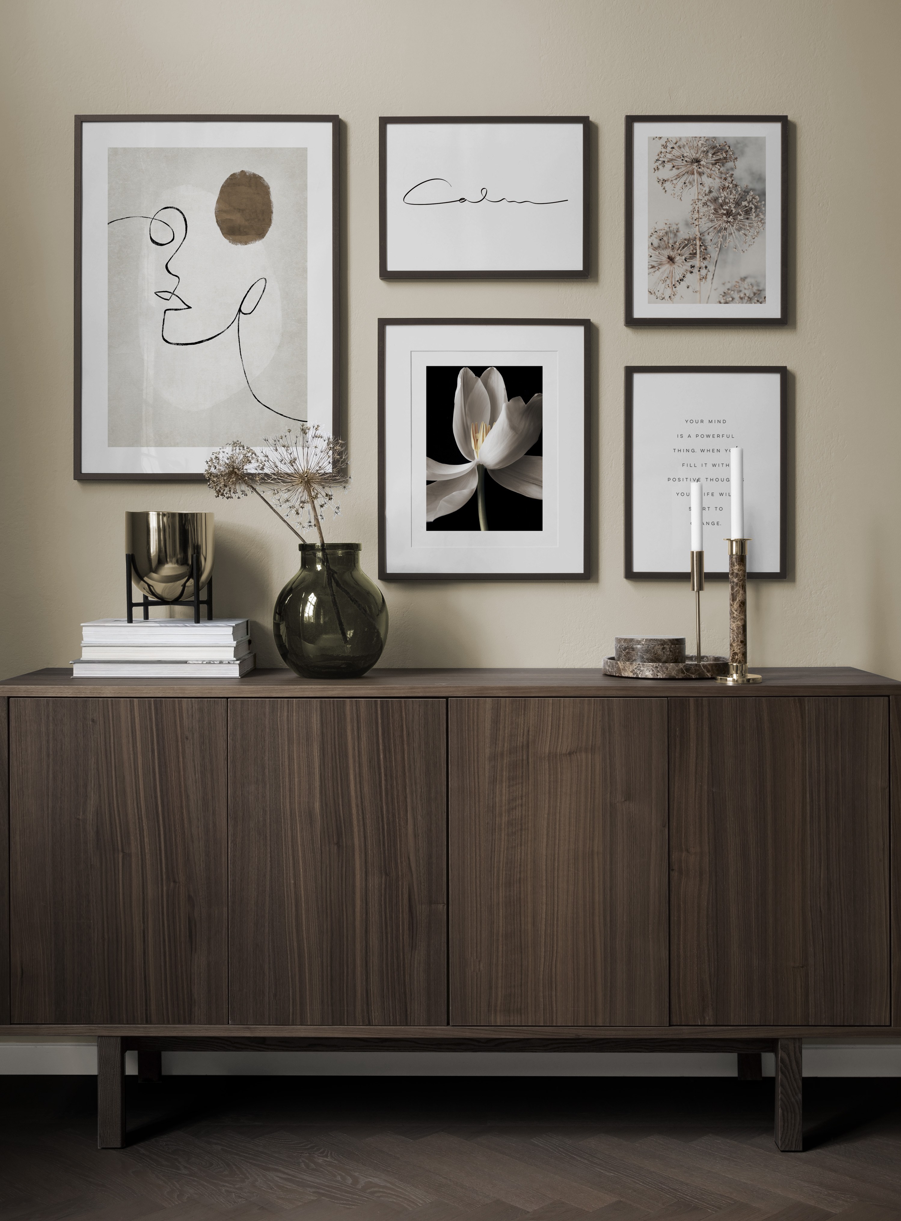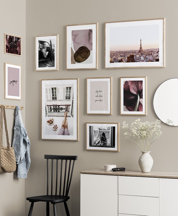 One of our best tips is to use storage as a canvas for your art – you don’t always need to drill holes into walls! Let prints rest on a hall shelf or bench against the wall, or assemble an elegant still life around the art. This will make it easy to vary your hallway decor according to the season or even your mood! If you prefer to hang up your art, you can compose a modern gallery wall that suits both small and large hallways.
