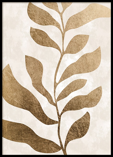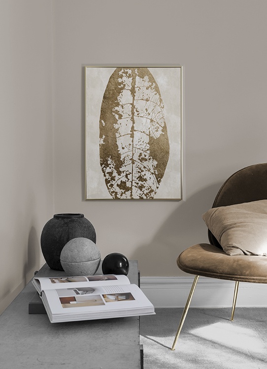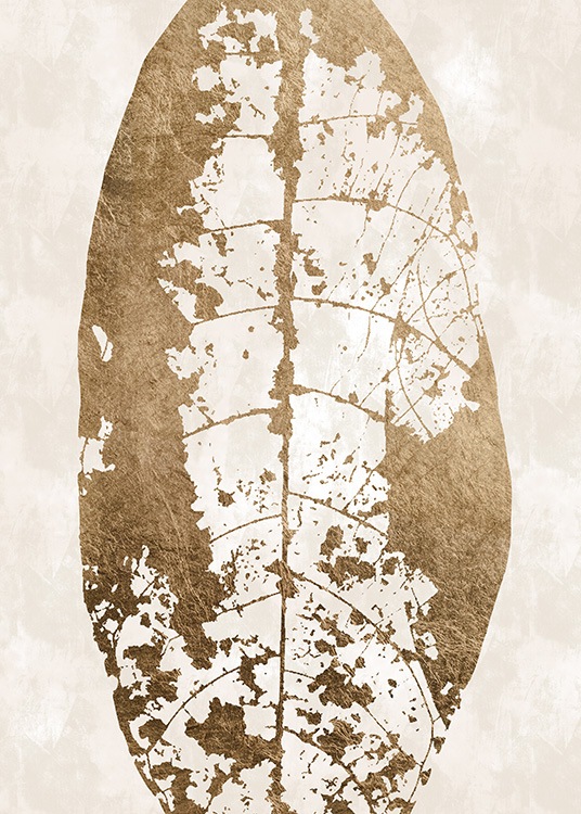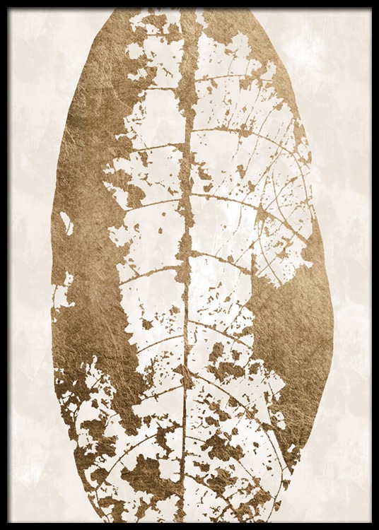 - Abstract art print of a gold coloured leaf with a skeleton structure, on a beige background
