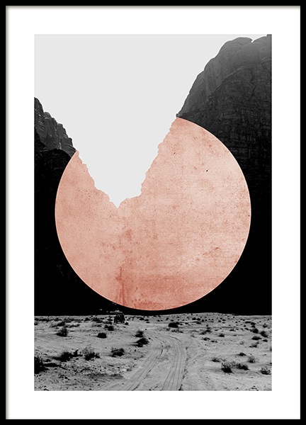 Handpicked design Graphic art print of black sand with graphic shapes in front. The three graphic figures in the foreground with their different colours complement the black sand and give extra dimension to the design.
