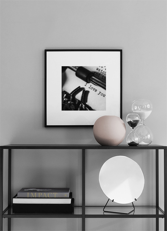Handpicked design "Black and white photo art with an old-fashioned typewriter design. On the paper in the printer it says ""I love you"" in English. A black and white square design that goes equally well in the living room or the bedroom.Poster with a white border which elegantly frames the design."