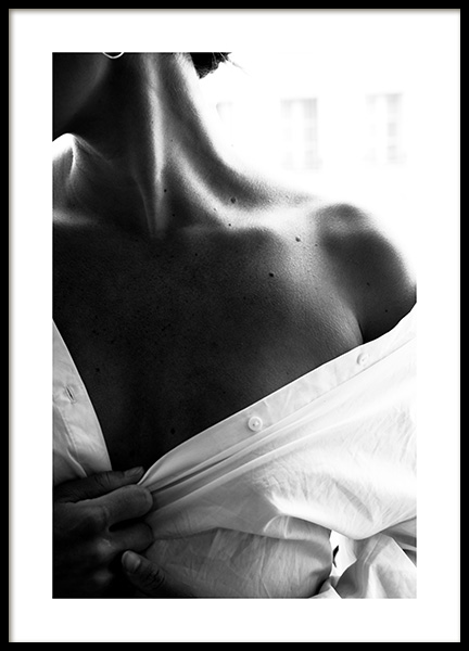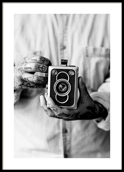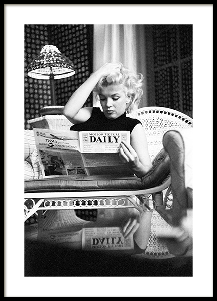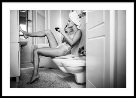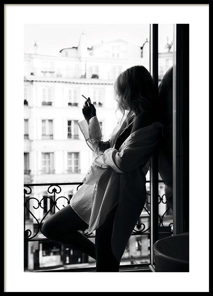 Handpicked design A black and white photograph of a woman standing in the kitchen and talking on the phone. She is dressed in a night gown with her hair up and is lighting a cigarette. The photo has a nice vintage feel to it. Poster with a white border which elegantly frames the design.