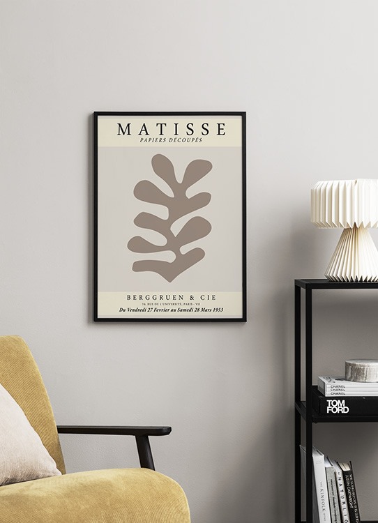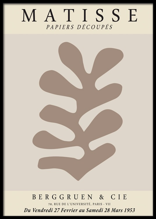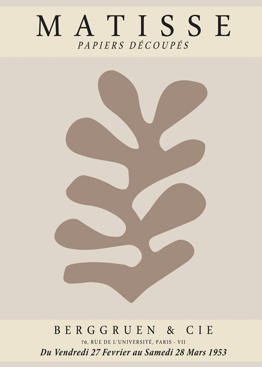 Handpicked design Graphic illustration of a brown leaf on a beige background, with the text "Matisse Papiers Découpés" at the top and text at the bottom. Make your home look like a museum shop with modern art prints, and find more matching styles in our category Art prints or Graphical!