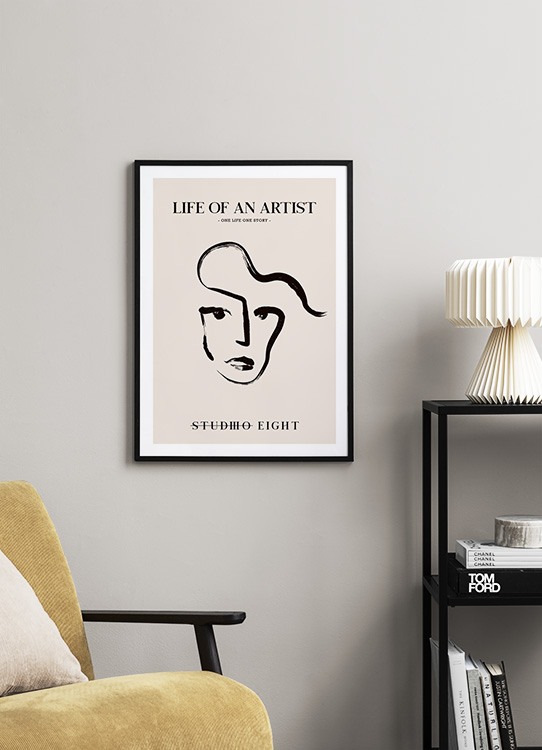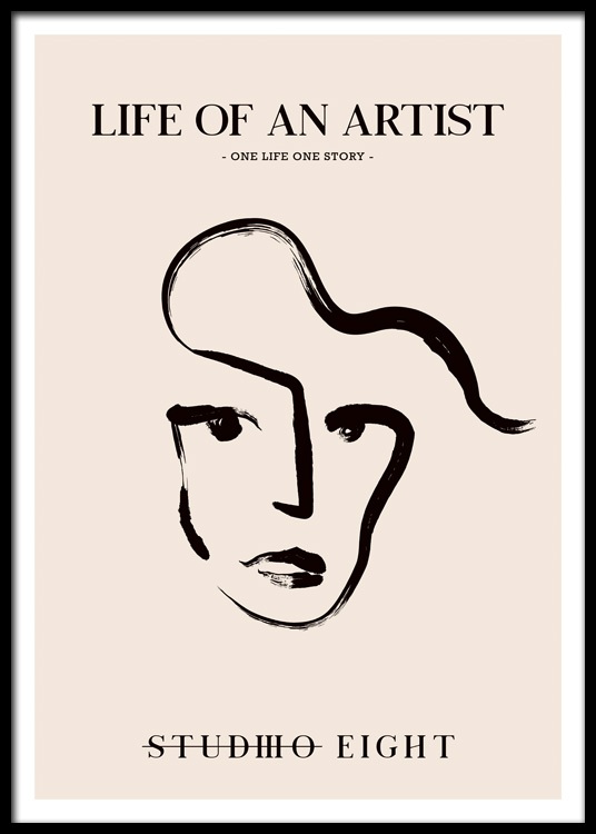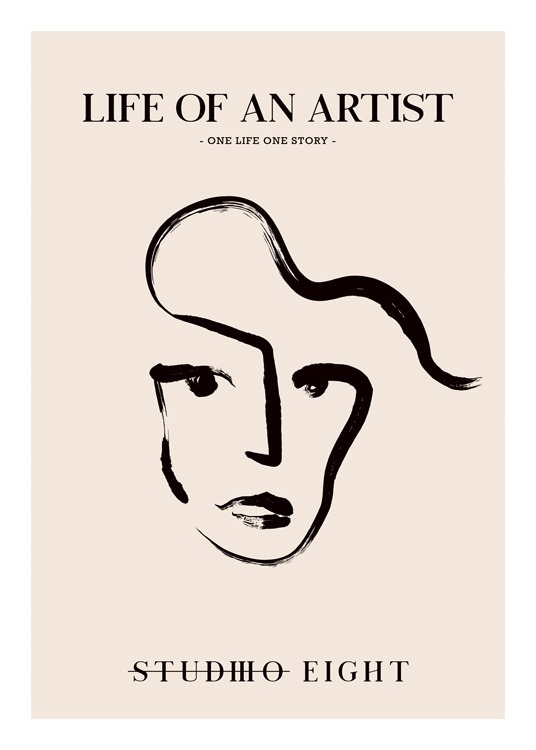 Handpicked design Line art illustration of a face in black against a beige background, with the text "Life of an artist – One life one story – Studio Eight" at the top and bottom. You'll find more matching styles in our category Line Art!