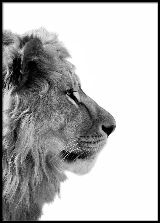 Handpicked design Photograph in black and white of a lion from the side. This powerful photo is ideal for hanging on a wall that you want to accentuate in your home! Animal prints are great for when you want to add some new life to your home, and you can with ease combine your very own gallery wall with powerful designs you love.