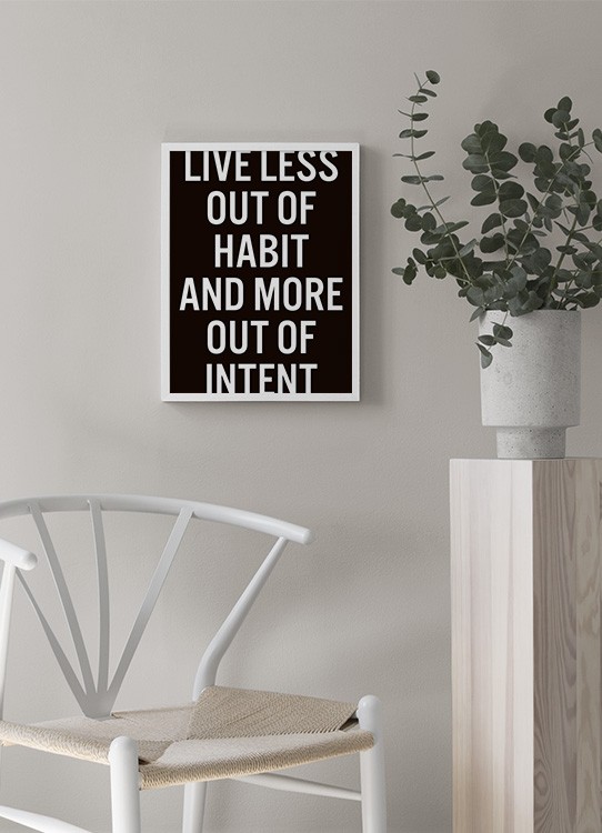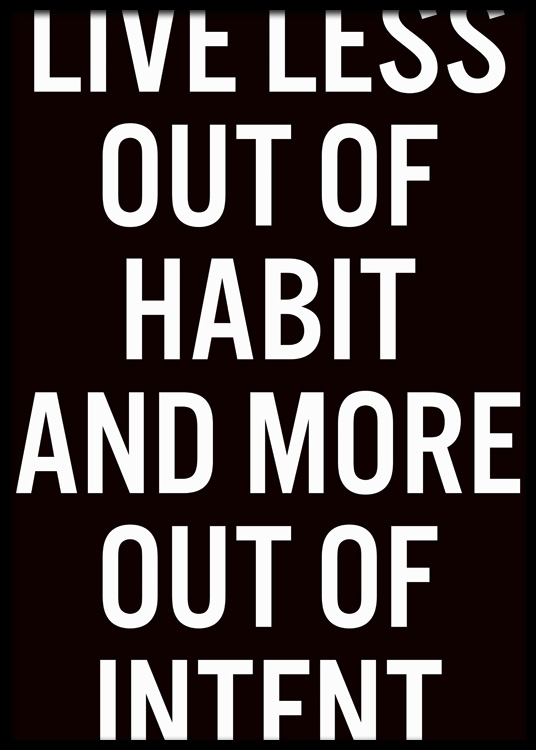Handpicked design Text poster with the quote "Live less out of habit and more out of intent" in white on a black background. Breaking habits is the first step towards change, and with this print you'll be reminded of that each day. Place the print somewhere you walk by often, and it'll never pass you by!