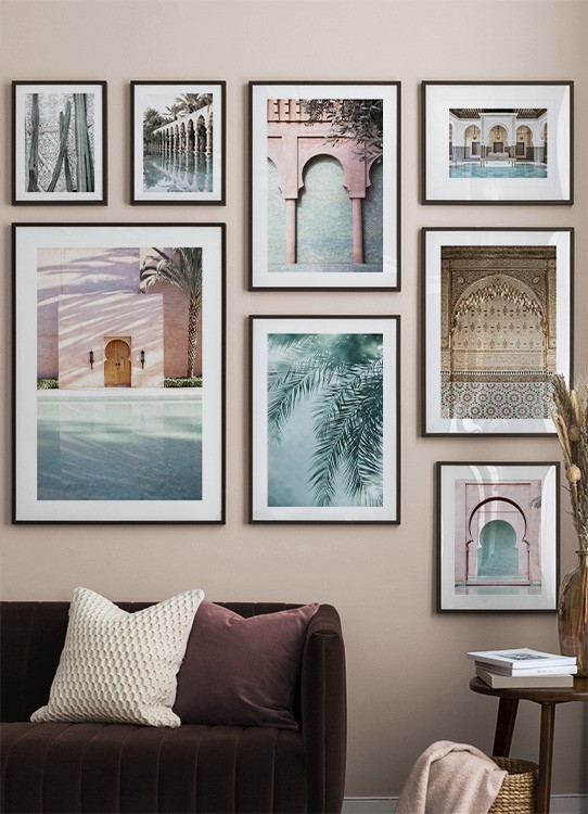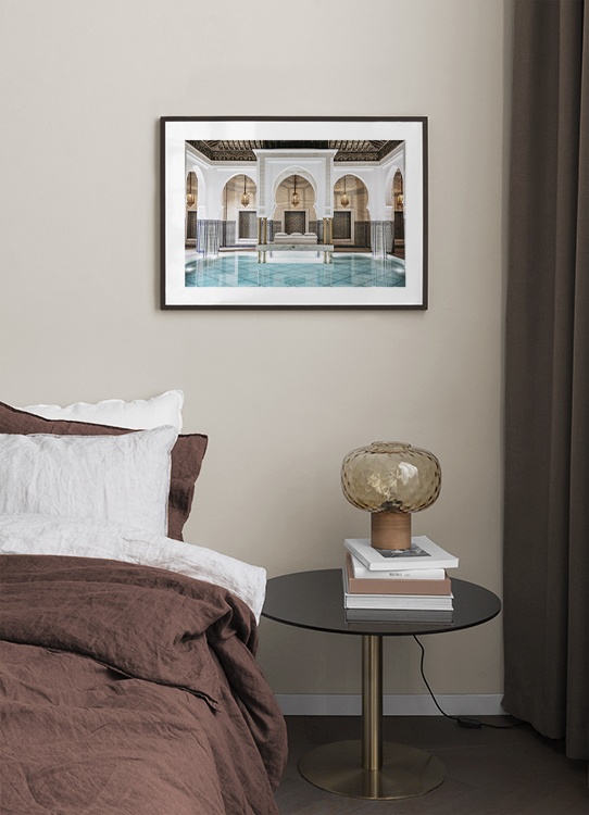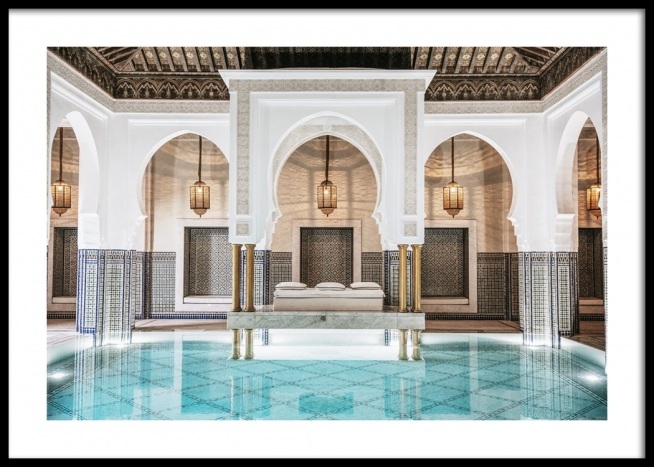 Handpicked design Photograph of a pool in a room with golden lamps, blue pillars and white, curved arches. This secret place holds both great tradition and artistry, making us fall in love every time. This print is part of Studio Amara, a photo collection shot by Desenio Design Studio in Marrakech.
