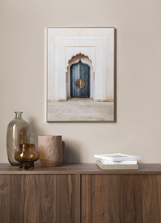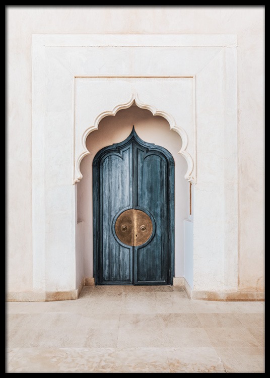 Photograph of a blue door with golden handles, and a curved arch with waves in front of it. Created with great detail, the architecture of Marrakech is known to many, and we're constantly blown away by the beauty of it! This print is part of Studio Amara, a photo collection shot by Desenio Design Studio in Marrakech.