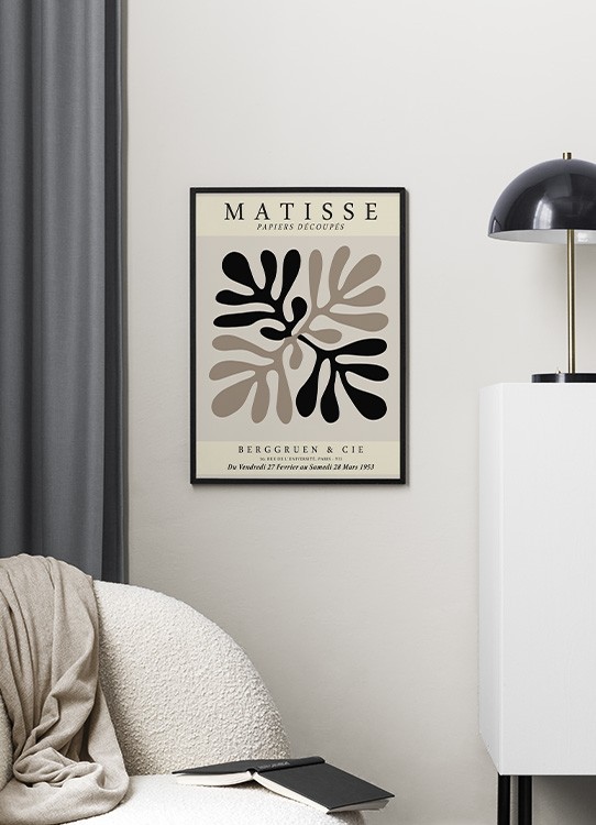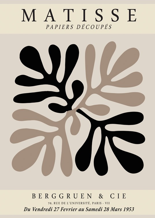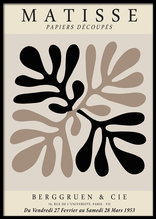 Handpicked design Graphic illustration with black and brown corals on a beige background, with the text "Matisse Papiers Découpés" at the top and text at the bottom. Find your favourite amongst our collection of Matisse prints! This classic style will give your home a whole new look, whilst maintaining a chic style.