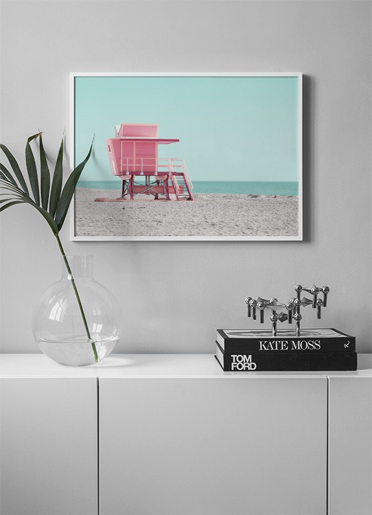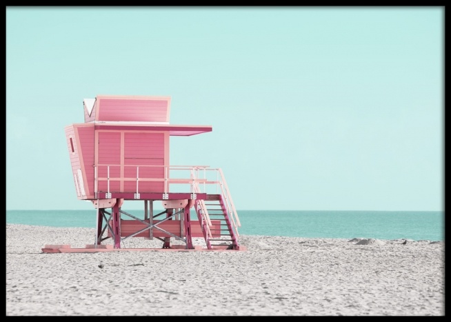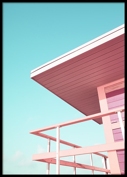 Handpicked design This trendy beach town, located on a barrier island a few kilometres from downtown Miami, is one of the country’s most well-known seaside resort cities and is bestrewn with colourful beach houses and instantly recognisable Art Deco hotels. The photo shows the contrast between the pink lifeguard tower and the blue sea that merges together with the sky and provides a lovely, summery feel.