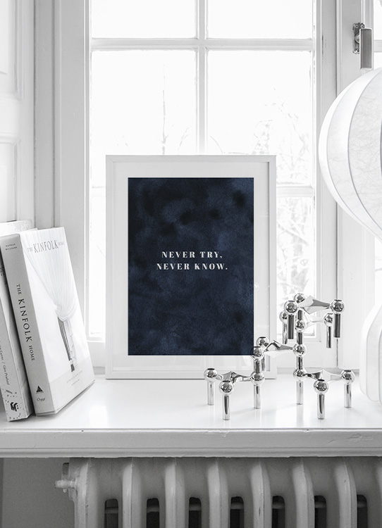 Handpicked design Text poster with the text "Never try, never know." in white on a dark blue background in watercolour. The classic quote "If you never try, you'll never know" might sound cliché, but as they say – clichés are often true. We couldn't agree more!