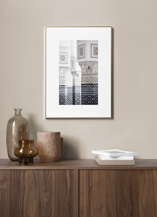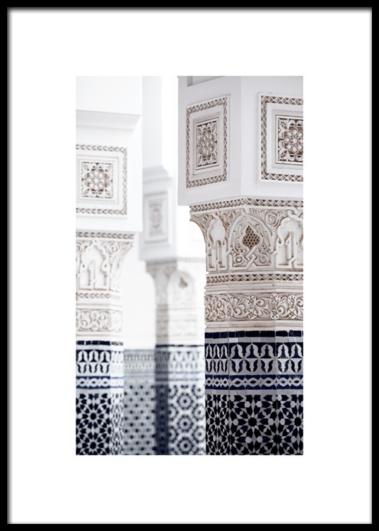 Handpicked design Close up photograph of pillars with blue and white patterns. With pretty pastels and beautiful patterns, photo art from Marrakech will make your home look brand new! This print is part of Studio Amara, a photo collection shot by Desenio Design Studio in Marrakech.