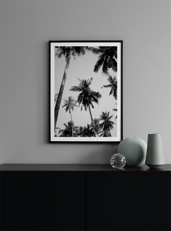 Handpicked design Black-and-white photo art poster. This exotic poster of palm trees makes for a stylish and trendy addition to your interior décor at home. It would be hard to miss the trendy popularity of palm trees, so what better way to get in on the act than to adorn your walls with palm trees? Make space for the exotic in your home and decorate your walls with botanical-themed prints! Our Floral category gathers all our posters with this theme and there you can find even more posters of palm leaves. The poster has a 'built-in' mount which elegantly frames the image.