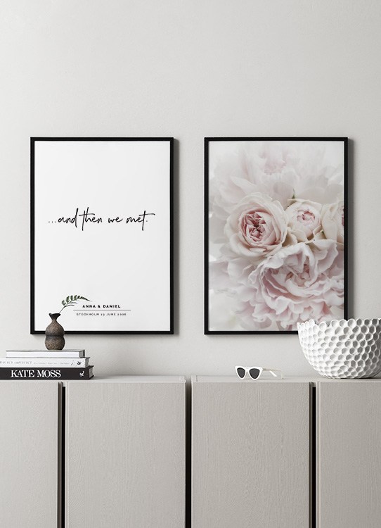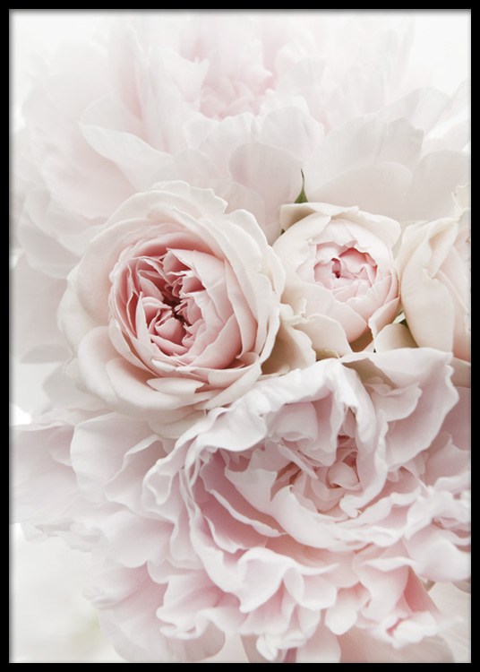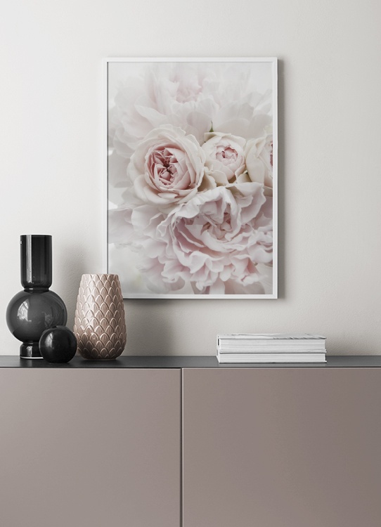 Handpicked design Photograph of light pink peonies and roses against a white background. This beautiful, floral print will add a romantic touch to your home, and soft pinks are truly something we never can get tired of seeing. This pretty print is ideal for a gallery wall for a bedroom, but will look just as good in a living room.