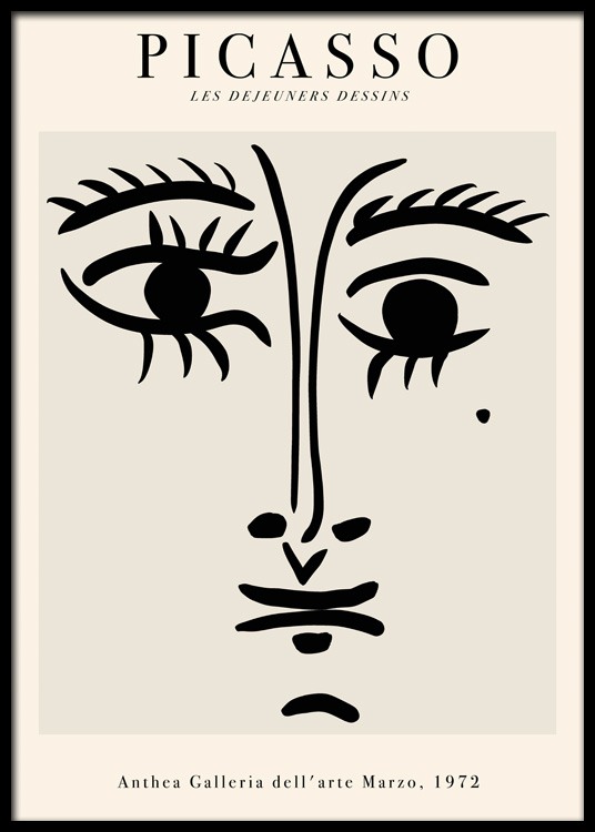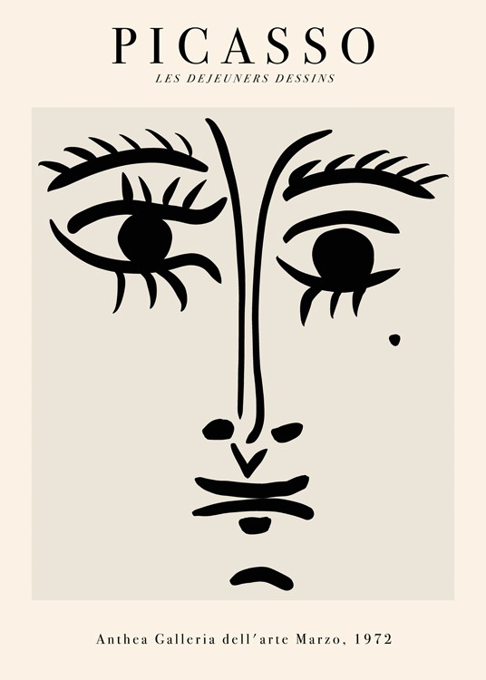 Handpicked design Graphic illustration with eyes, a nose and lips in black line art on a beige background, with the text "Picasso Les Dejeuners Dessins" at the top and text at the bottom. Get inspired with our art prints, with their roots from various known artists around the world. This classic style fits every home!