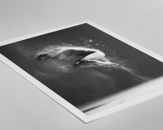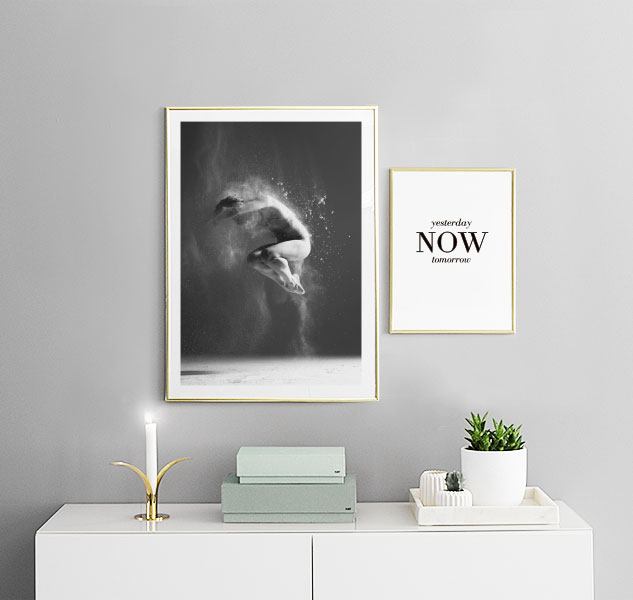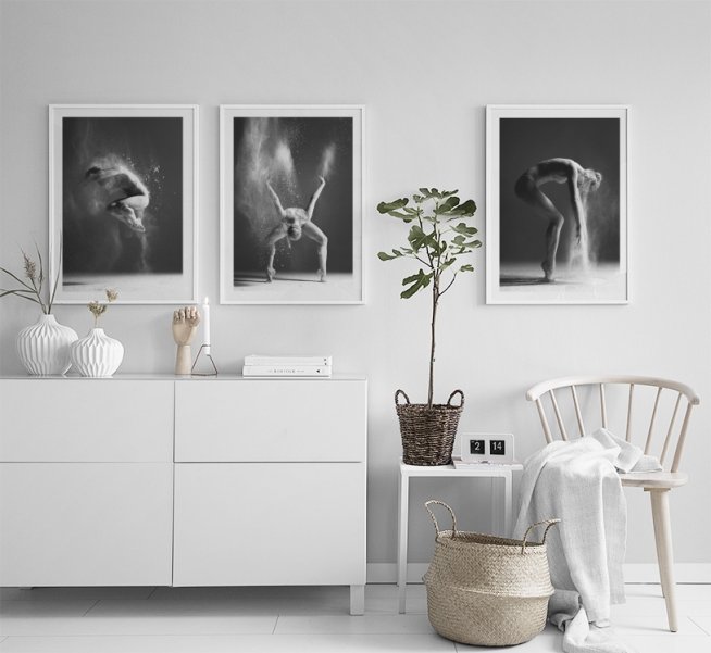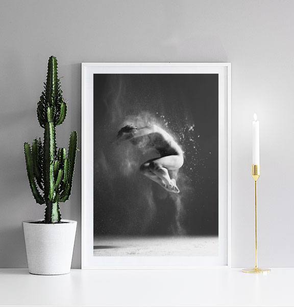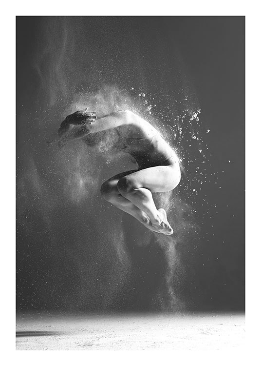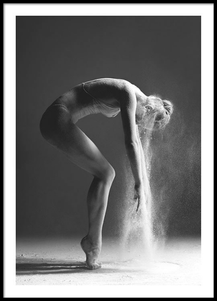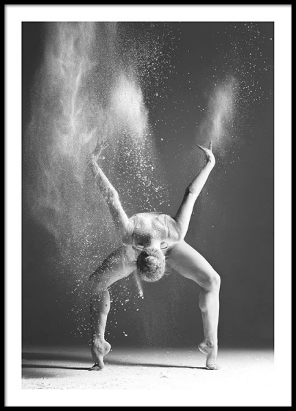 Handpicked design Poster with black and white photo of a dancer captured in an intense movement. A very striking image that will look very nice on a wall in any room. Take a look at more posters in the Photo art category. Many of the motifs are stylish to match together. The poster has a built-in mount which elegantly frames the image.