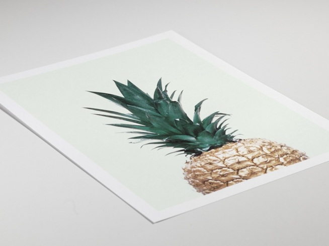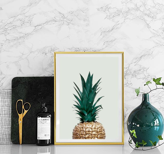 Poster of gold pineapple on a light green background. Stylish and trendy. Works with many decorating styles. The poster has a built-in mount which elegantly frames the image.