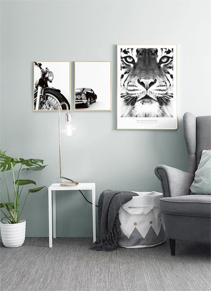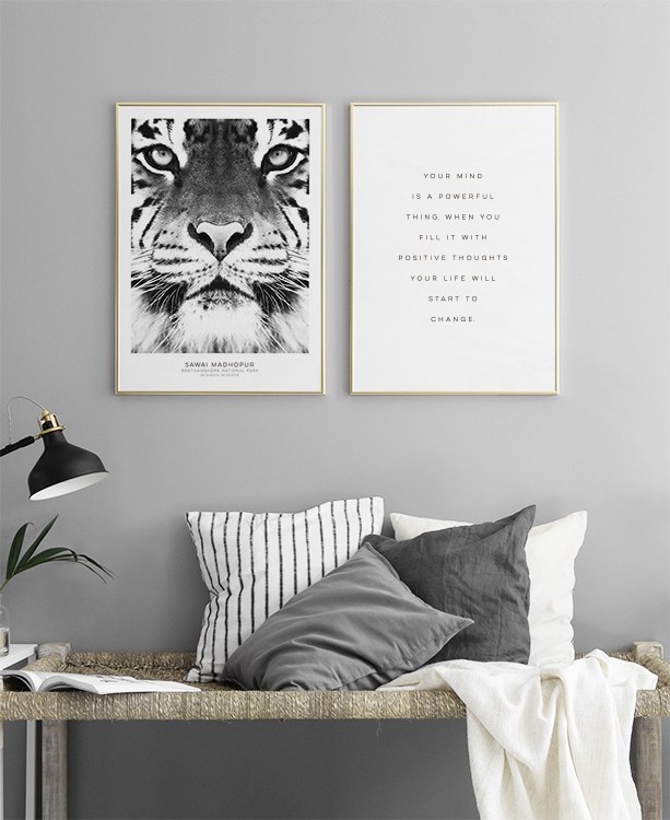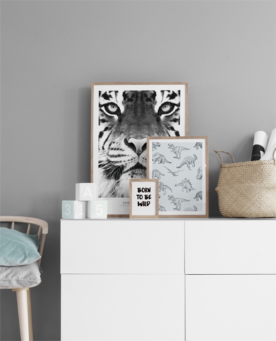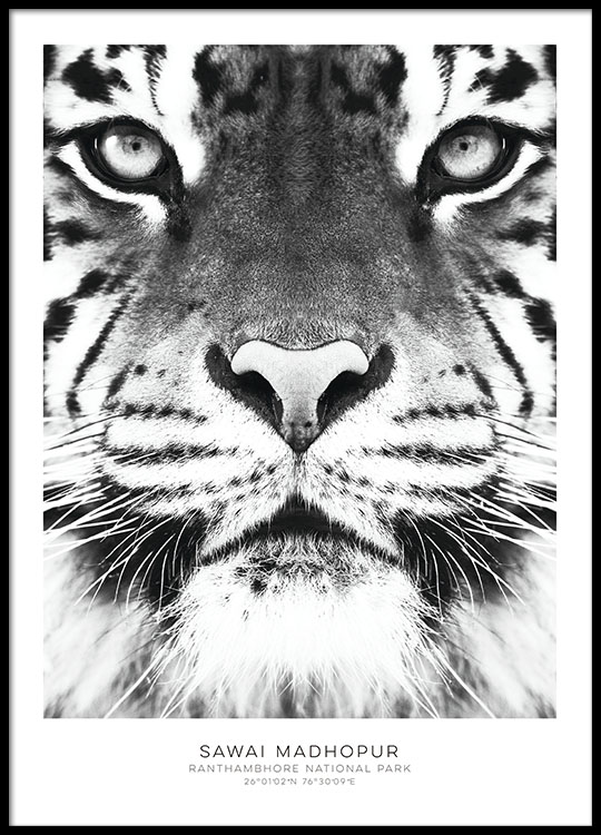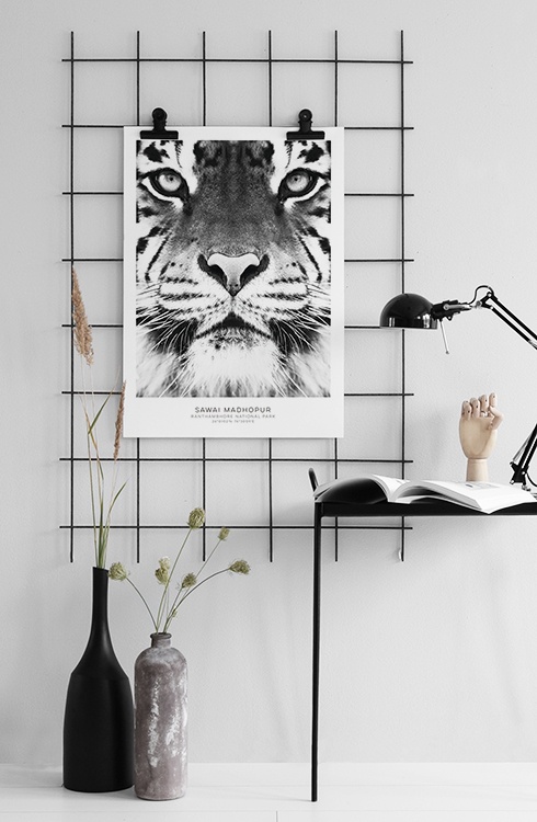 Handpicked design Black-and-white photo of a tiger that works equally well on its own in a stylish frame or as part of a gallery wall. You can match this photo with others of wild animals from our categories Insects and Animals or Photographs. We have plenty of stunning prints and posters of animals and nature, in both colour and black-and-white. Combine them however you like in a beautiful gallery wall! The poster has a 'built-in' mount which elegantly frames the image.