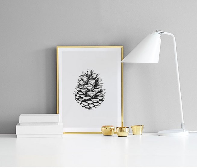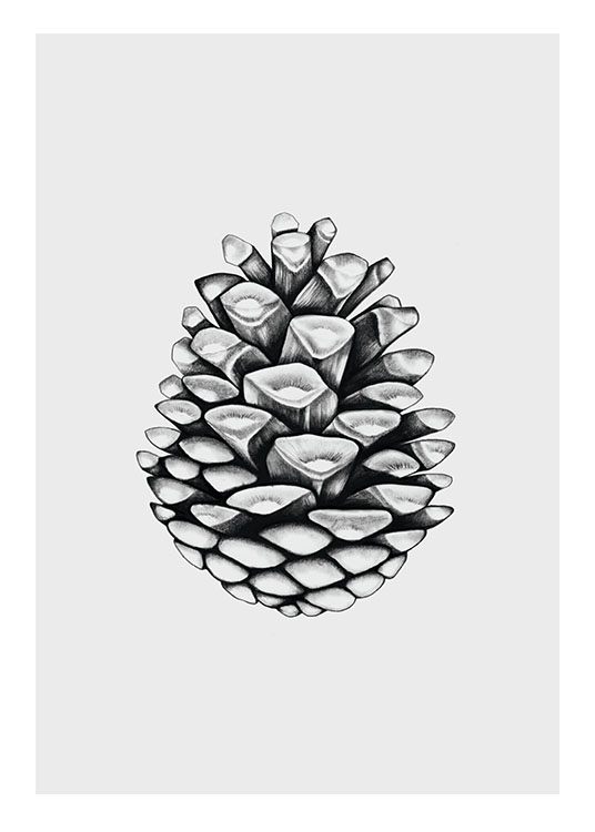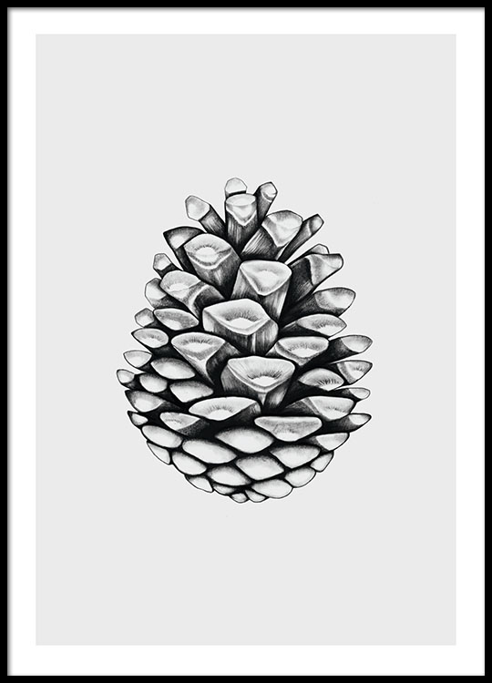 Handpicked design A cute black and white poster with an illustration of a pine cone, hand-drawn in a realistic style. Very nice to have on the wall or on a shelf. You can combine it with other hand-drawn motifs or typography prints. Only your imagination can limit you when you create your own picture wall. The poster has a built-in mount which elegantly frames the image.