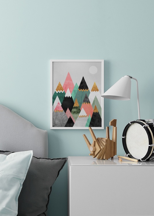 Handpicked design Poster with the mountain design in various colours. This print, created by Elisabeth Fredriksson, with a mountain design in different colours and with gold details would be an attractive decoration in most homes and would fit seamlessly into different kind of rooms. You can find more posters with artistic and graphic designs under the categories Art prints and Graphical. Find your favourite posters to match and create your personal photo collage!