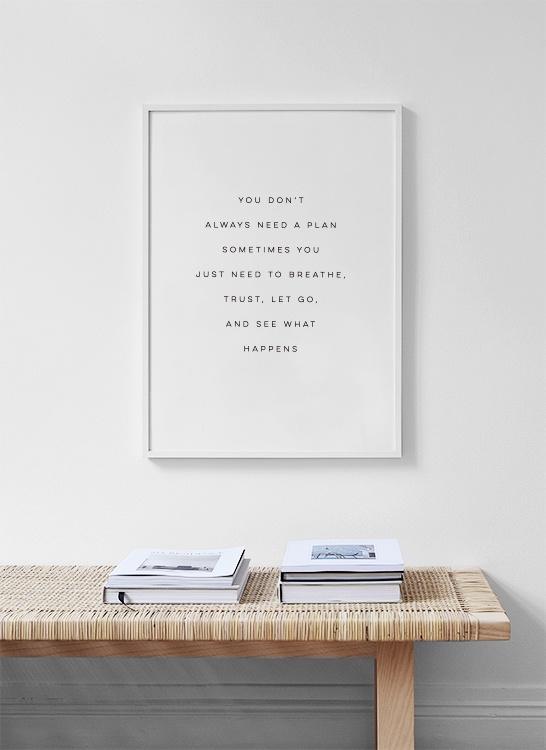 From €9.10Black-and-white typography print. This poster with a quote is ideal for decorating any room in your home and is also a nice reminder about liberating and trusting yourself. The text in this print reads: 'You don't always need a plan, sometimes you just need to breathe, trust, let go, and see what happens'. We have a wide range of posters with quaint quotes that you can find in our Typography and Quotes category.