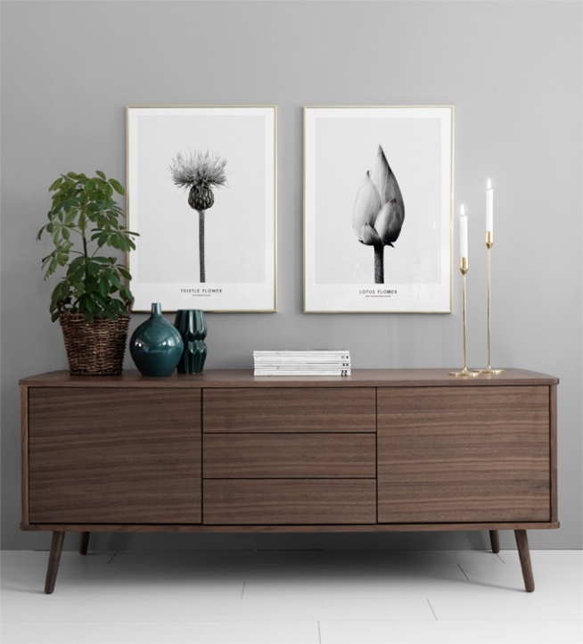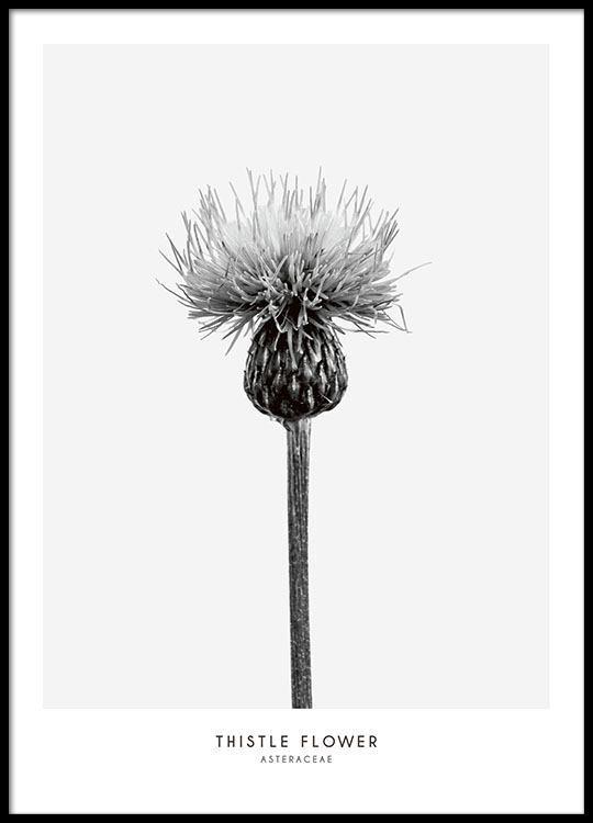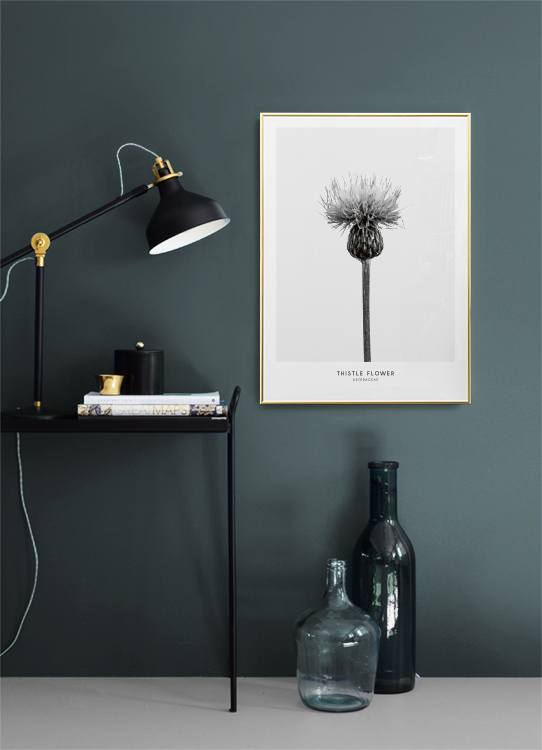 Handpicked design Black and white botanical poster with a photograph of a thistle flower. The poster has grey background and a white border. Match this poster with our other botanical poster from the same series, the Lotus Flower. This stylish and decorative poster will fit most interior styles and will looks great in any room. Need inspiration on how to style your walls? Shop through our inspiration rooms! Our posters are printed on matte, 200 gr uncoated paper. The poster has a built-in mount which elegantly frames the image.