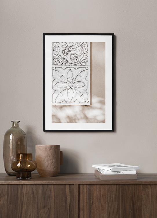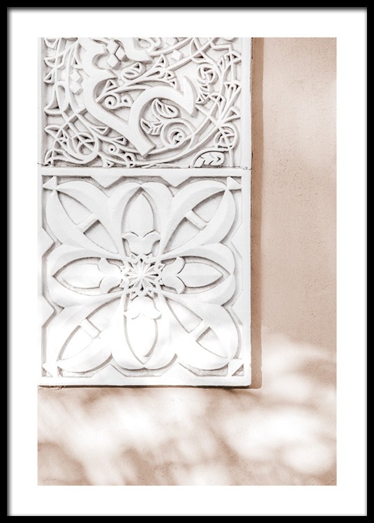 Handpicked design Close up photograph of white tiles with carved patterns on a light pink wall. Formed with a sense of detail, the human legacy of Marrakech is truly something. This print is part of Studio Amara, a photo collection shot by Desenio Design Studio in Marrakech.