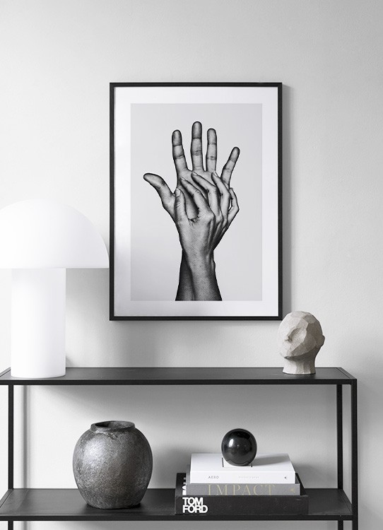 Handpicked design Photograph in black and white of two hands touching each other, against a light grey background. Black and white photo art is one of the most classic styles, fitting for all homes and rooms!