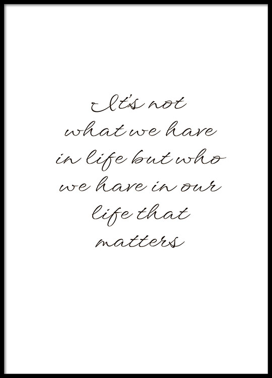 From €5.57Black and white text print with the text 'It's not what we have in our life, but who we have in our life that matters'. A lovely quote worth thinking about, and also perfect to put in either hallways or bedrooms. You can find more text and quote prints in our Text posters category.