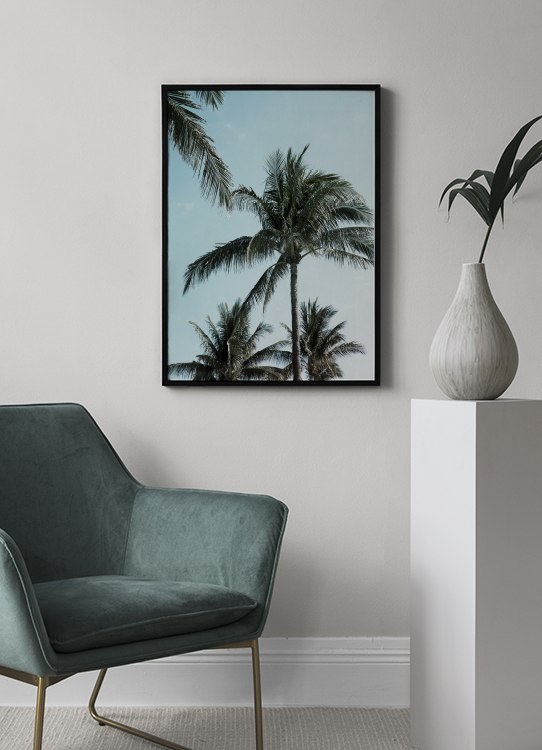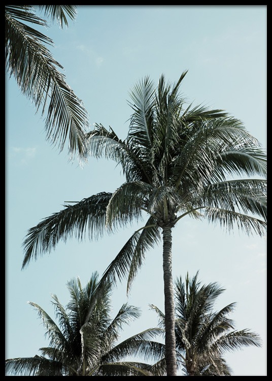 - Botanical poster with tropical palms and a blue sky in the background.