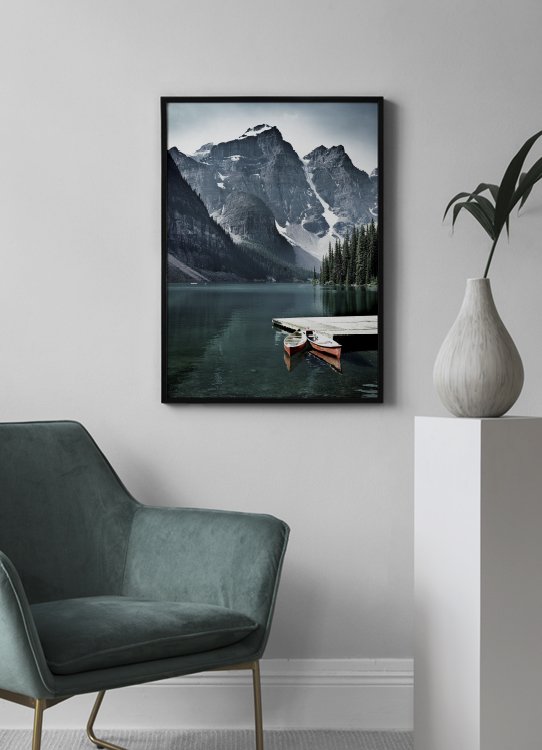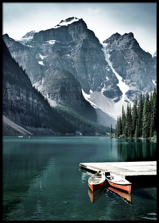 Photograph of two red canoes next to a small pier in a lake, with a forest and large mountains in the background. If you're someone who gathers strength from nature, our selection of nature prints and photographs should be the given choice for your home! Find more peaceful prints in our category Nature.