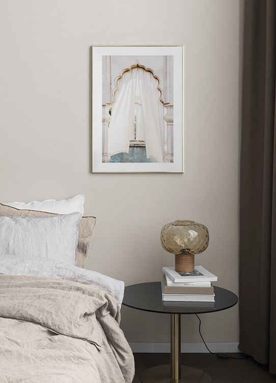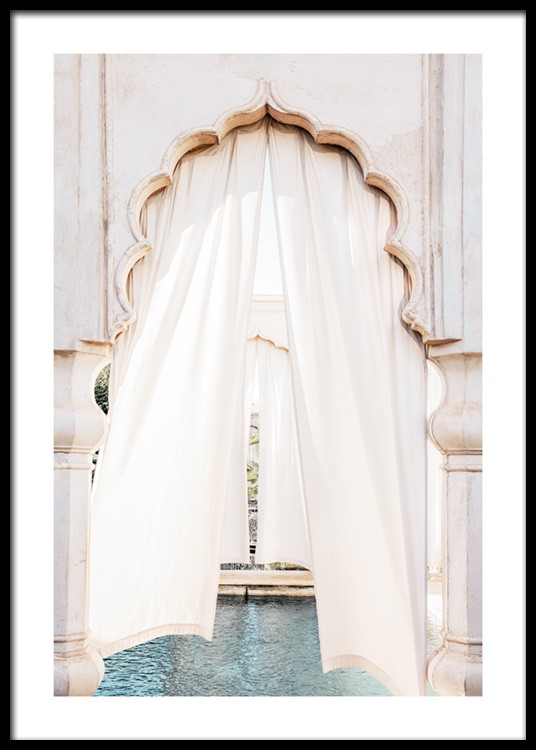 Handpicked design Photograph of a white curtain in a curved door arch with a pool in the background. Featuring colourful tiles, curved arches and beautiful architecture, Marrakech is truly a magical place. This print is part of Studio Amara, a photo collection shot by Desenio Design Studio in Marrakech.