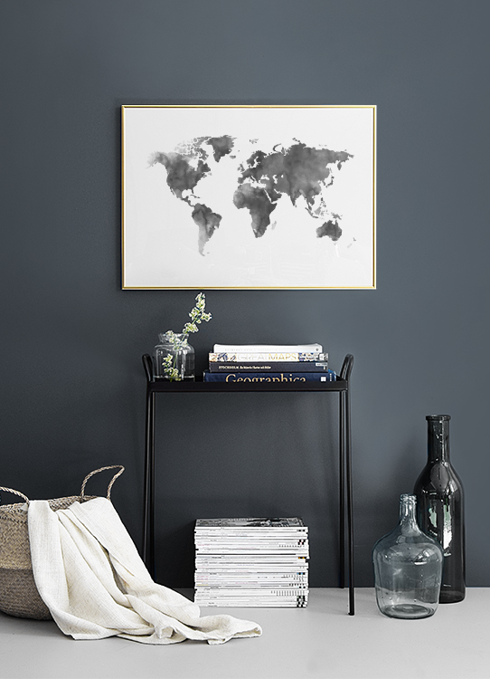 From €5.57World map painted in grey watercolour on a white background. This popular print in monochrome colours fits perfectly in any gallery wall, and it's also a great fit for kids rooms! Posters are not only something decorative, they can also serve an educational purpose. Find more in our Maps and Cities category!