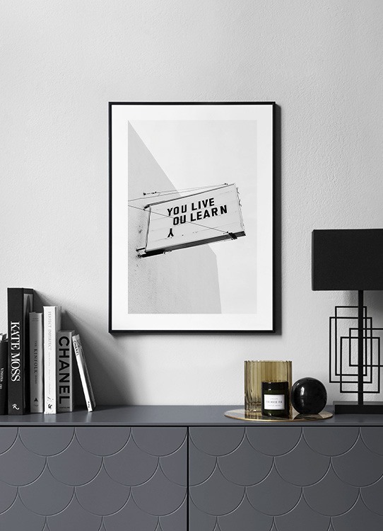 Handpicked design Photograph in black and white of a vintage sign on a building with the text "You live you learn". Remembering that life is a journey and that every experience is an opportunity to learn will be easy with this print on your wall!