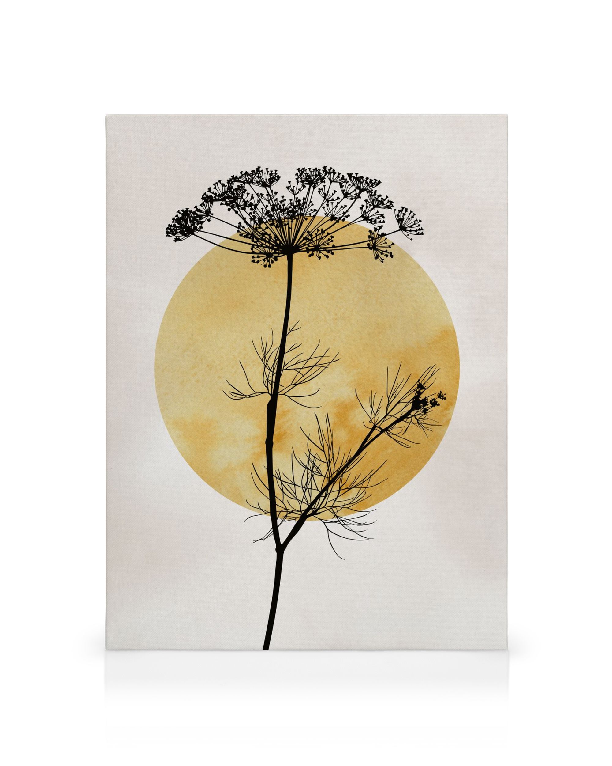 Illustration of a black plant with a dark yellow sun behind it, on a beige background. The colour structure in the background creates a bit of movement and depth, perfect for a living room wall!